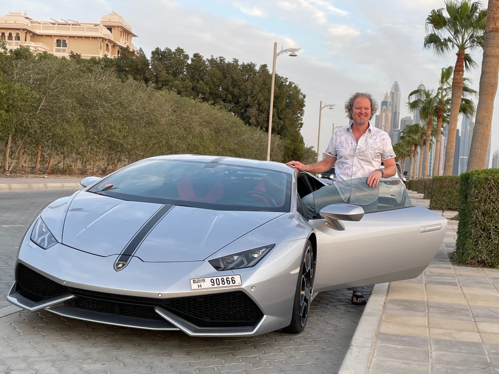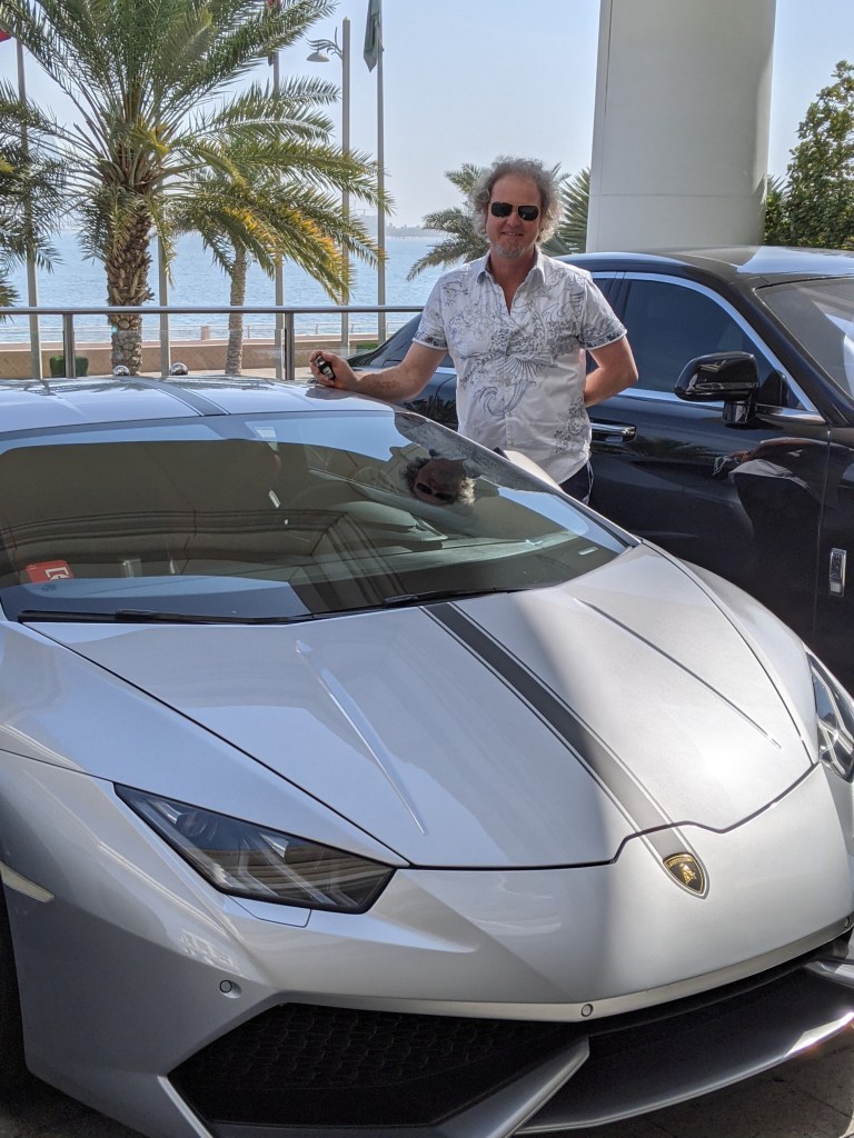 Breakfast was fantastic, with a large buffet consisting of pastry, perfectly cooked sides and mains, fruit, salad and made to order local cuisine, all served either inside or out in the perfect Persian Gulf morning. The only difficulty was keeping the calorie count low enough! Kelly had seemed oddly preoccupied with her phone this morning, but today was my birthday and if there is one thing that she loves it’s celebrating someone’s birthday. She asked “Are you ready?” and with excitement I nodded yes. On our way out the front door I stopped to take a photo of the array of fabulous cars parked in front, and after I was done with the glamor shot she… handed me the keys to the silver Lamborghini Hurracan! OMG!