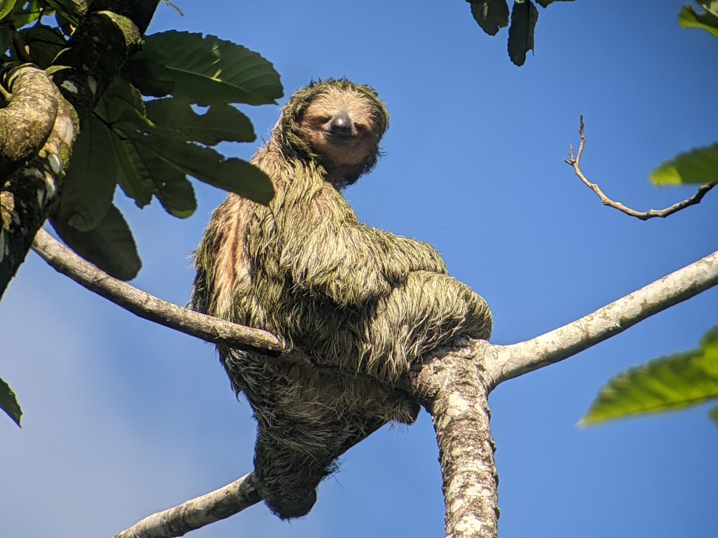 But not for long, as we had an all day tour booked with @jacamarnaturalist. We enjoyed an in room coffee followed by the breakfast included with our stay, and then headed to the front of the property to await Jose, who picked us up promptly at 0800 in an air conditioned van. Jose is a naturalist and has been giving tours in Costa Rica for over 30 years. Costa Rica requires tour guides to be trained extensively, so we were excited to listen to someone knowledgeable tell us all about his country. He found the first sloth on our drive.