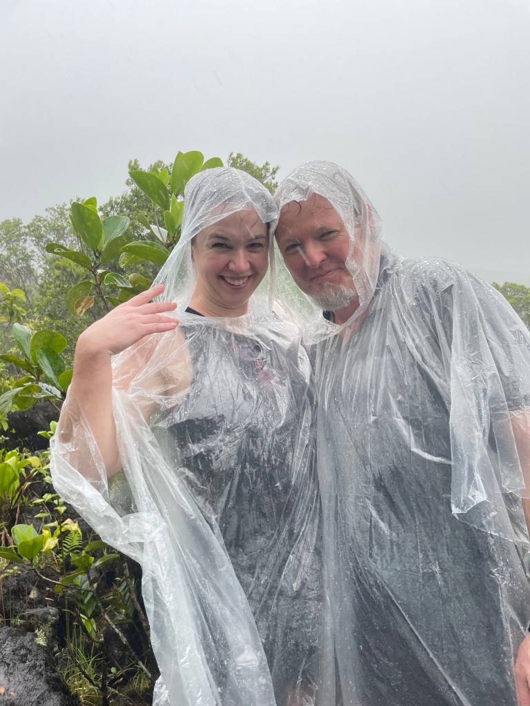 After a lovely lunch provided by the tour company at their compound, we headed out to the west side of Arenal for our hike at the base of the volcano- under threatening skies. Nature did not fail to give us a show, as it absolutely poured on us. Late afternoon showers are a pretty frequent phenomenon here, so be prepared with rain gear. Kelly and I bought inexpensive plastic ponchos at a local supermarket, and they worked quite well, although our feet were soaked.