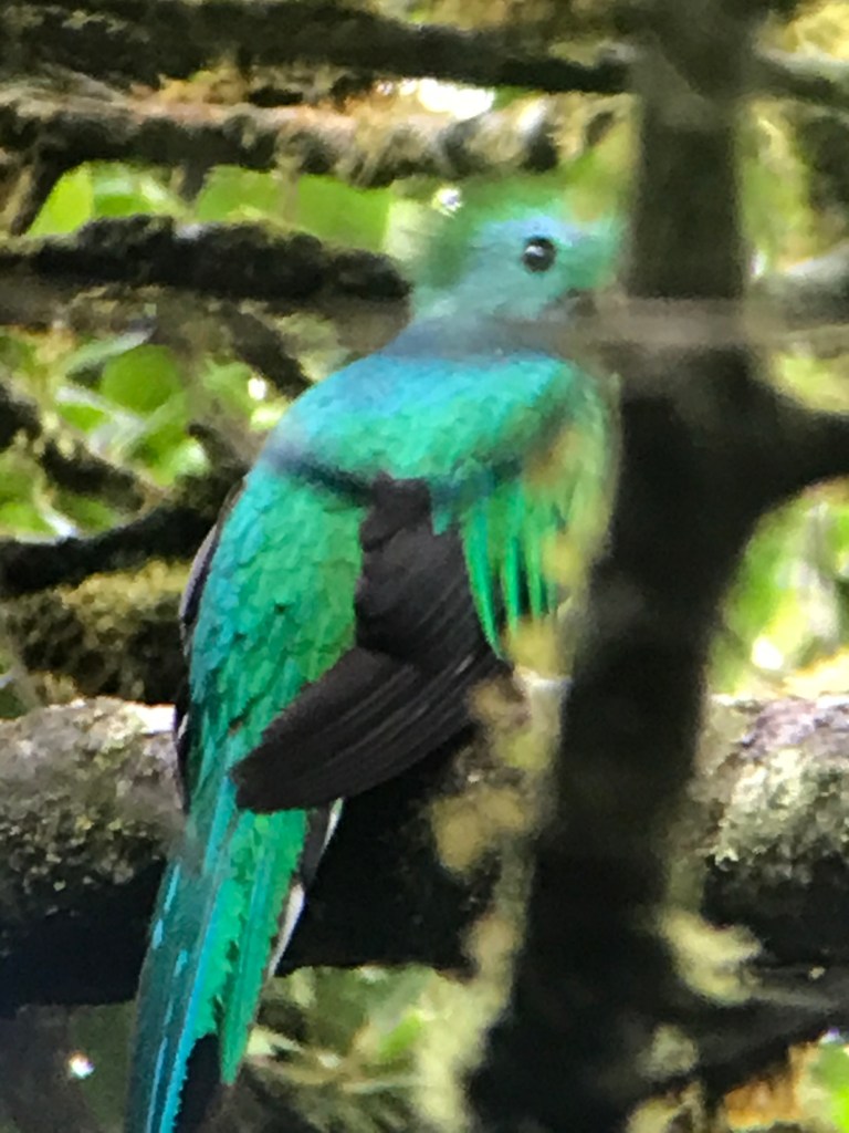 Our guide proved to be an indefatigable hunter of the elusive Quetzl, the lovely blue bird which was hunted near extinction due to the males two very long tail feathers, which were used to decorate Mayan headdresses for centuries. He heard the call of the bird and led us on a merry chase, running this way and that, until we finally spotted it!