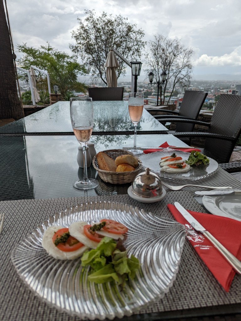 And when we weren’t luxuriating in our fabulous room, we enjoyed the fantastic deck overlooking Windhoek, along with champagne and hors d’oeuvres and service like you wouldn’t believe.