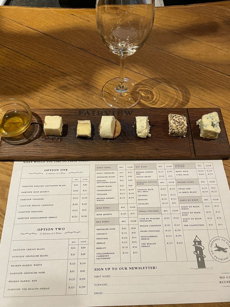 Our guide, Charleton, was able to chat with us throughout the tour about the various wineries, regions, mountains, traffic, memes, or whatever else caught our fancy. Any question asked was answered promptly. A short 45 minutes out of town and we were at our first winery, Fairview, which was set up for wine tastings and cheese pairings.